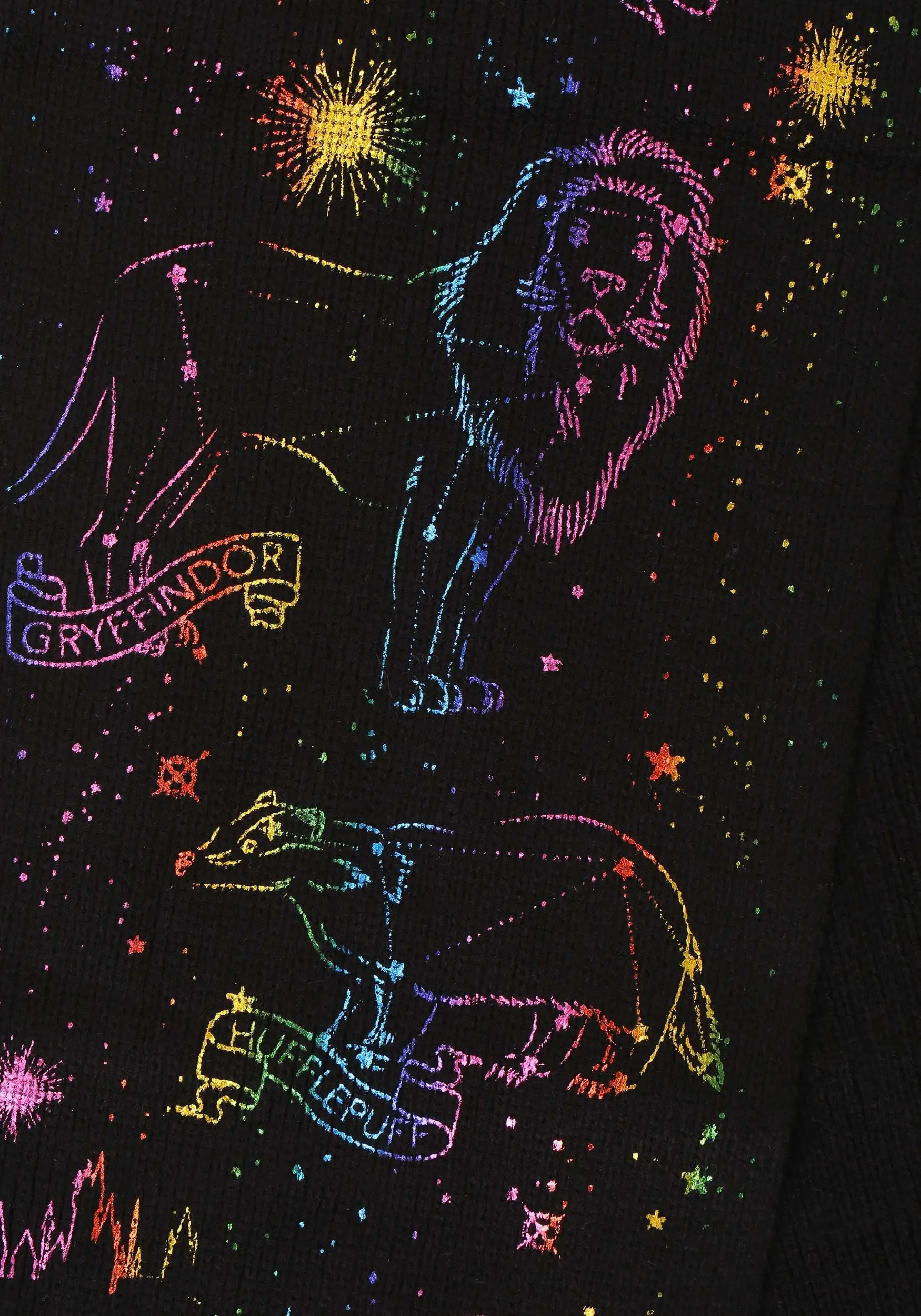 - Multicolored metallic print images of the Hogwarts house emblems against a background of stars