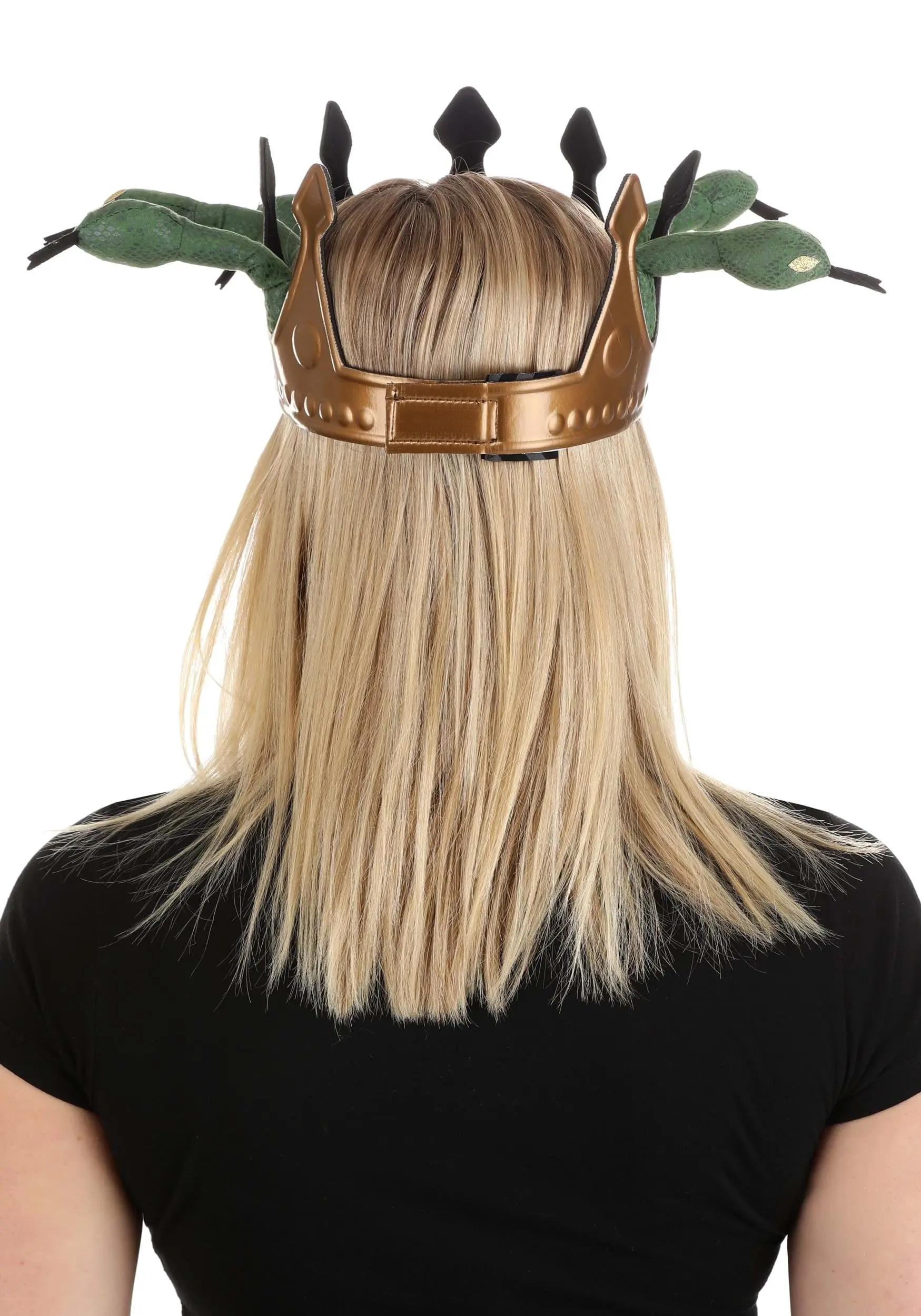 You will create memories of monstrous proportions in this stunning topper. The base is a classic crown shape with royal details, and it adjusts in size to fit you perfectly. There is a large emerald-green faux gem front and center, as well as stuffed snake heads protruding all around.