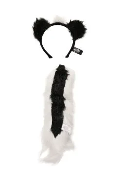 This black and white look is the easiest skunk transformation out there with fuzzy ears and a fuzzy tail. The black ears are attached to a soft fabric-lined black headband and have a fluff of white to let everyone know you aren’t just a run-of-the-mill bear. The tail attaches to pants or a dress by pin or hook and loop fastener.